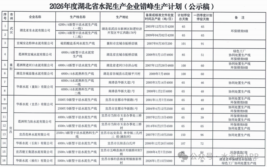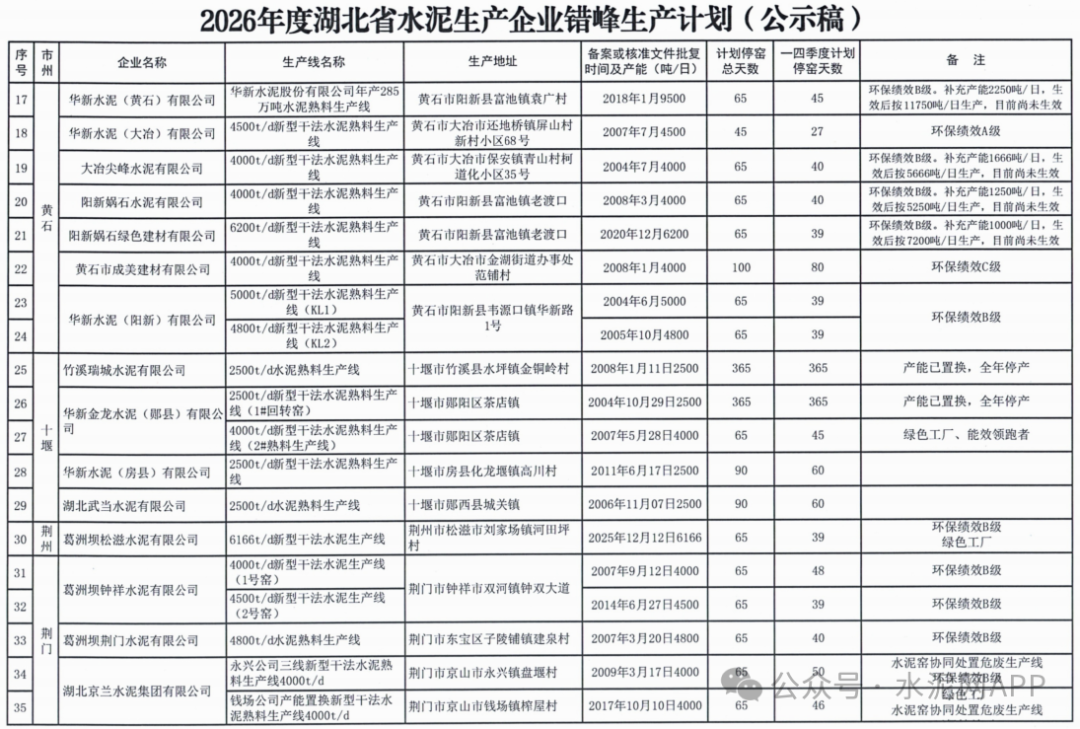 4月10日,湖北省經(jīng)信廳發(fā)布“2026年度湖北省水泥生產(chǎn)企業(yè)錯峰生產(chǎn)計劃公示”。