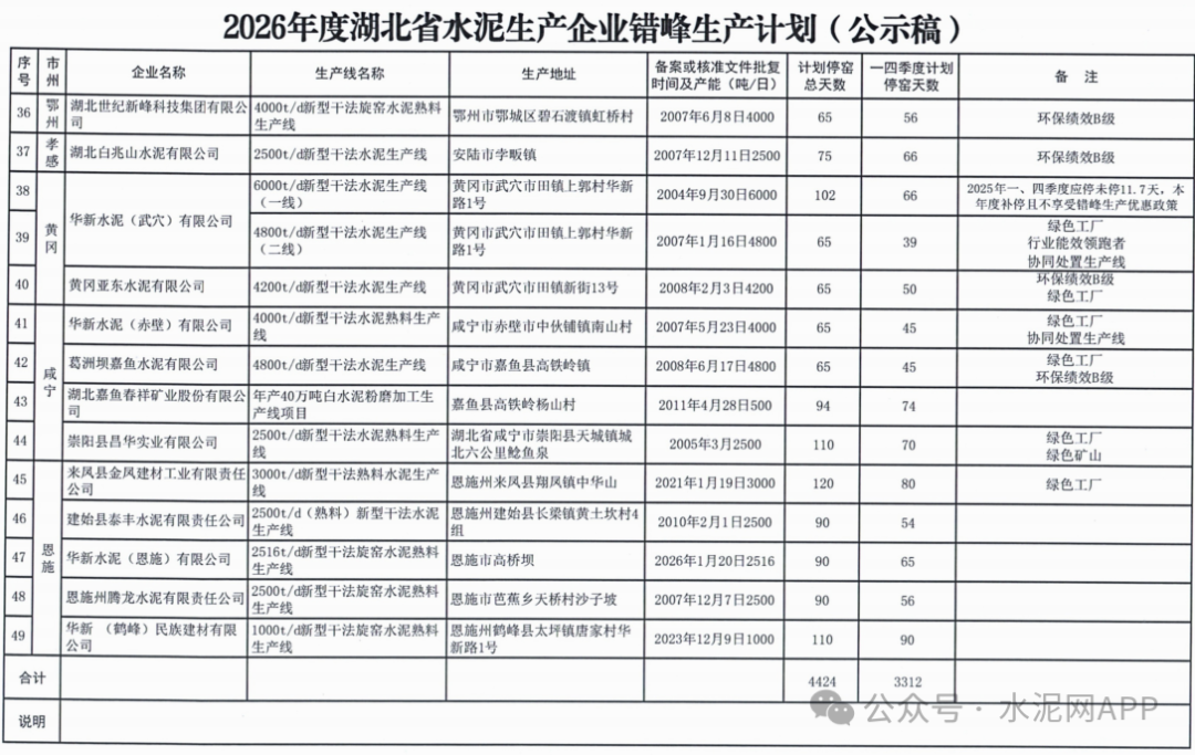 計劃顯示,2026年度湖北省共計49條熟料生產(chǎn)線參與錯峰,計劃停窯總天數(shù)在45天-150天之間,此外竹溪瑞城水泥2500t/d熟料生產(chǎn)線及華新金龍水泥(鄖縣)一條2500t/d熟料生產(chǎn)線產(chǎn)能已置換,全年停產(chǎn)。